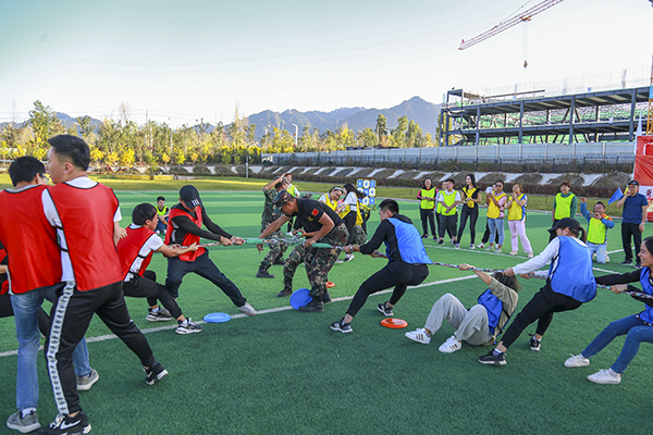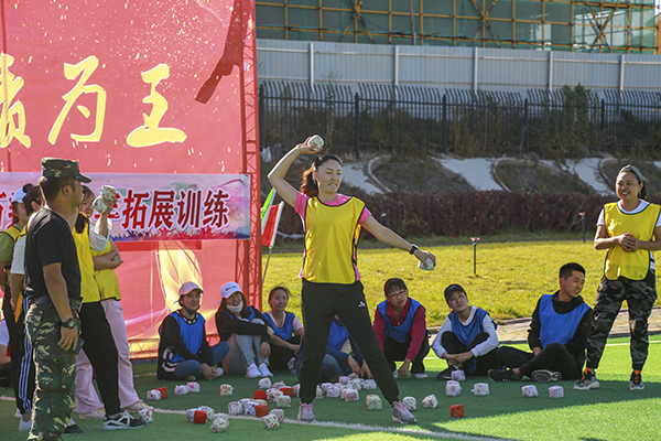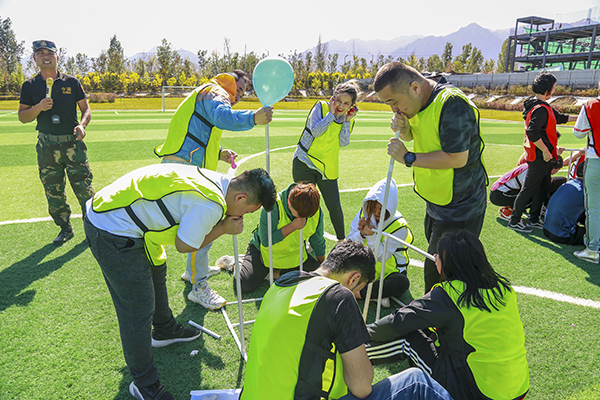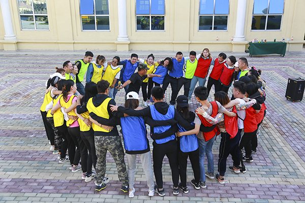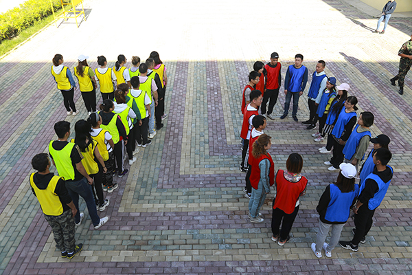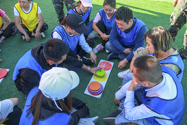训练场上,教训要求5分钟内建立起小组文化,全体人员分四组、起队名、画队标、任命队长等工作。最终,“精英队”、“战神队”、“战狼队”、“敢死队”相继组建完毕。四个小组在23日这天进行了多种趣PK活动,有团队接力PK活动:袋鼠运瓜;团队配合PK活动:疯狂毛毛虫;团队整体完成项目:呼吸的力量;团队竞技项目:标靶;团队智力协同项目汉罗塔;团队配合PK活动:多人多足;团队力量PK活动:拔河比赛等等。