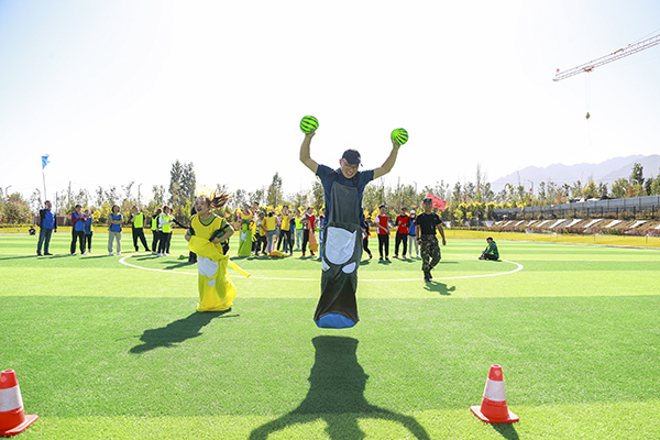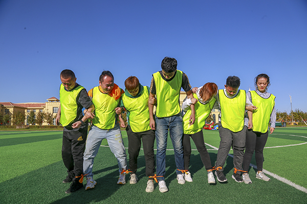此次比赛需要团队的默契度与配合度,如果有一位队员步伐不一致,全队都有摔跤的可能,各队队员在比赛开始前,全心的投入练习阶段,不断的调整方式方法,调整队员,调整站队,统一节奏,摸索方法,从刚开始的走不成、不会走,到最后团队能小跑起来。而满怀信心的“精英队”在比赛中有一队员乱了节奏,另一队员绳子松开,导致整个团队停滞难行,此时,“战狼队”顺利到达终点,赢得此项目的第一名。