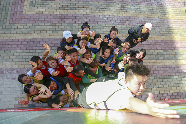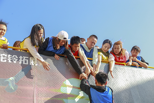 接着教练让人梯的这些家人站到前面,翻开他们的衣领,一个个的肩膀上都带有血迹的鞋印痕迹,教练说,这才上去三个人,他们的肩膀都成了这样,想想看,咱们团队有32位都在踩着他们的肩膀上去,时间观念呐,每增一秒,他们就多一份疼痛,此时此刻,所有成员都泪流满面,有愧疚,有心疼,有感动,这一刻,我们不分民族,不分男女,不分年纪,心靠在了一起。第二次挑战正式开始,在听到口哨声后,所有人以最快的速度进行着,成功上去一位,两位,三位,翻到墙上的人全齐伸手拉着向上攀爬的人,此刻没有任何的声音出现,只有紧张的心情,只有感动的泪水,剩余的人越来越少,所有人的心越来越紧张,最后四位,最后三位,最后一位....,墙上的成员倒挂在墙面上,伸手拉最后一名队员,在艰难的攀爬过后,墙上的人成功的拉住了他的手臂、小腿,拼尽全力向上拉着.....终于,最后一名也成功翻上去了,用时:10分57秒,比预计的时间缩短了将近49分。