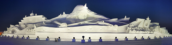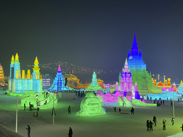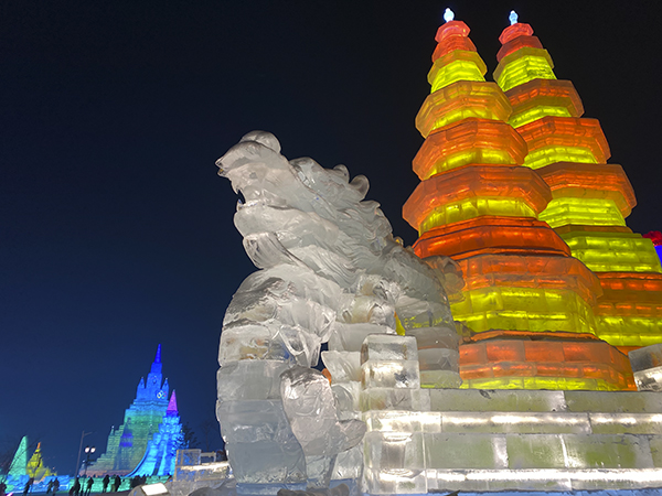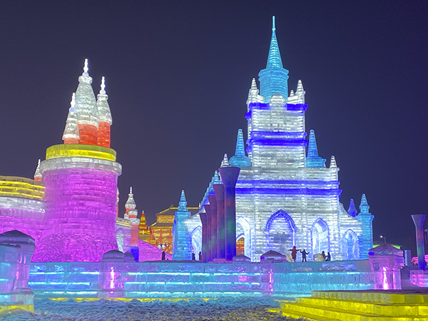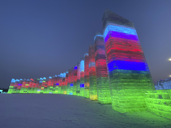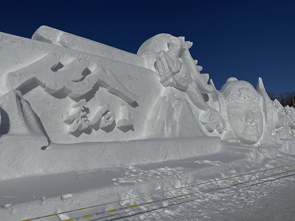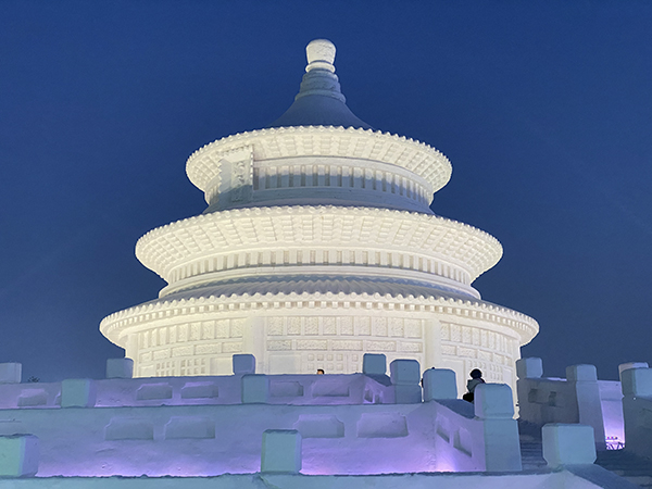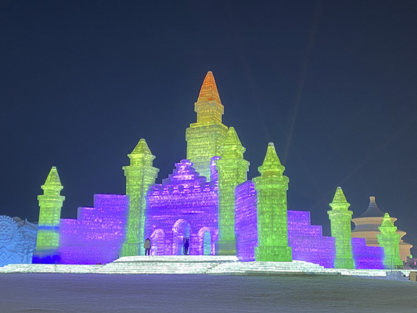 吃饱喝足后,大家随即出发前往长春冰雪大世界。到达目的地后,已经下午四点半了,华灯初上,冰雪大世界简直就是银装素裹里的五彩缤纷,最先映入眼帘的便是园中“冬奥记忆”雪雕。最引人注目的就是雕刻在正面的一名拉着小提琴的女孩的身影,洁白的雪让女孩精致的五官纯洁神圣,整座雪雕都透出圣洁之感。