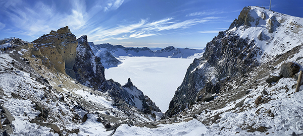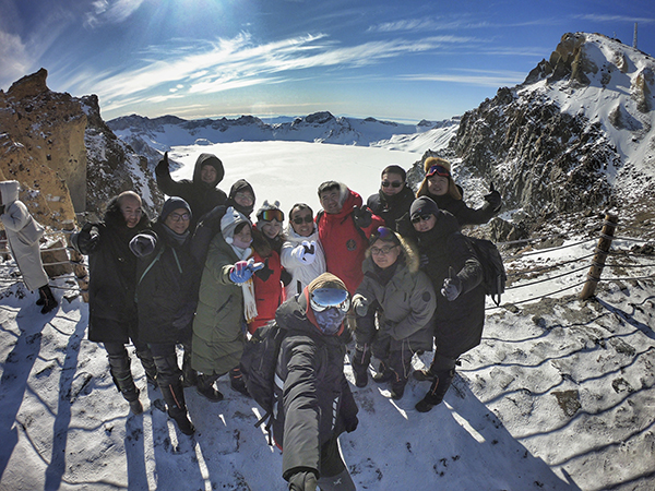 沿途成片的白桦树从身边飞过,顿时就有林海雪原的感觉。大约近3小时车程,到达长白山北坡风景区。我们来到景区大门口进行大合影。从北坡直接乘车到达长白山主峰,经过一段跋涉,终于登上了海拔2670米的长白山主峰天池,俯瞰天池映入眼帘的时候是多么震撼,覆盖上了一层白雪,像是在水面上加了一层结界,看起来更神秘动人。据说长白山十有九雾,每年只有100多天的时间可以看到,只有运气爆棚的锦鲤才能一窥真容,幸好我们万乘人来的时候天公作美,让我们瞧见了长白山天池的真容。
