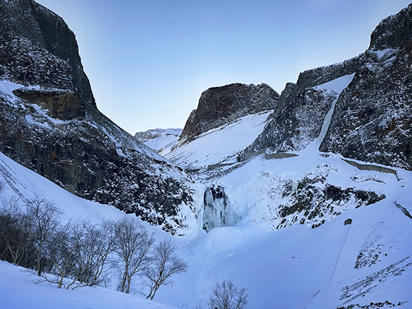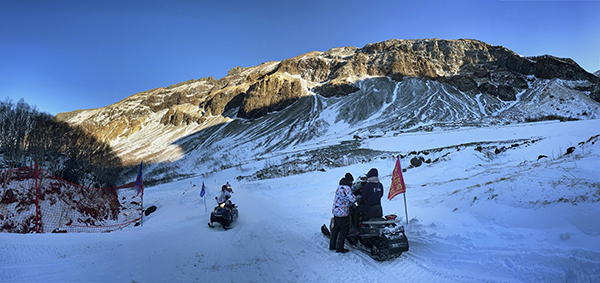 吃过午饭后,大家前往长白山瀑布。长白山瀑布被列为“世界上落差最大的火山湖瀑布”大世界吉尼斯之最。作为长白山第一胜景的长白飞瀑,还有一个最大的特色,就是一年四季水流不息,这在海拔2100米多的高纬地区是非常少见的。大家分别乘坐雪地摩托,虽然师傅没好太炫车技,但也足够惊心动魄。山路上疾风回雪,像快速卷过的云。沿着聚龙温泉群的木栈道走到底,便到达了长白山瀑布,但是由于再往前积雪很厚,所以游客止步。长白山瀑布在冬日只能远观。