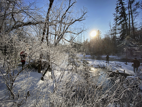 16日一早,大家收拾行李重新出发,途中邂逅了心驰神往的华美雾凇,飞驰在热血沸腾的高山雪道。从二道白河镇经途长白山魔界风景区,感受原生态神奇。说到“魔界”,一定会联想到美国大片《魔戒》,或者香港恐怖片《魔界》。不过,我们这里去的魔界,是长白山脚下一个相当有“魔力”的地方。每到冬季,当气温达到零下二十摄氏度时,雾气蒸腾,出现雾凇和树挂。河中那些枯树在日出时分大气蒸腾,树和雾若有若无。