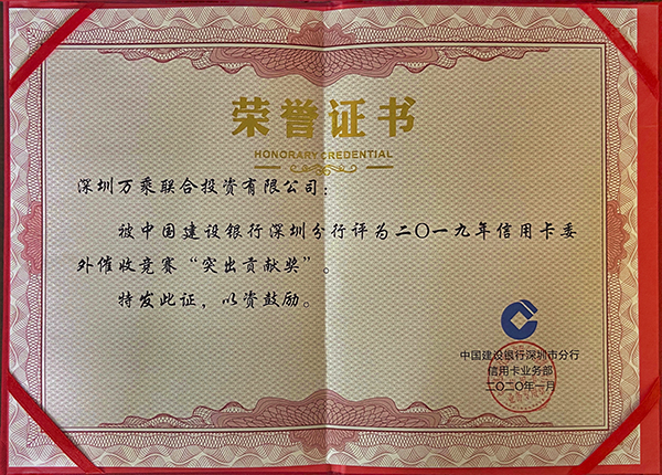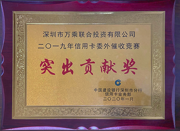 2020年1月17日,深圳万乘参加了建行深圳分行信用卡中心召开的“2019年度委外催收总结暨2020年一季度工作会议”,深圳万乘由于在建行深圳分行2019“劳动竞赛”全年业绩名列第一,分行卡中心总经理杜总和副总经理林总为我们颁发了“突出贡献奖”。