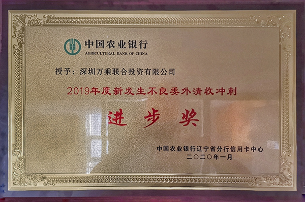 2020年1月21日,辽宁万乘荣获中国农业银行辽宁省分行颁发的“2019年新发生不良委外清收冲刺进步奖”奖牌。
