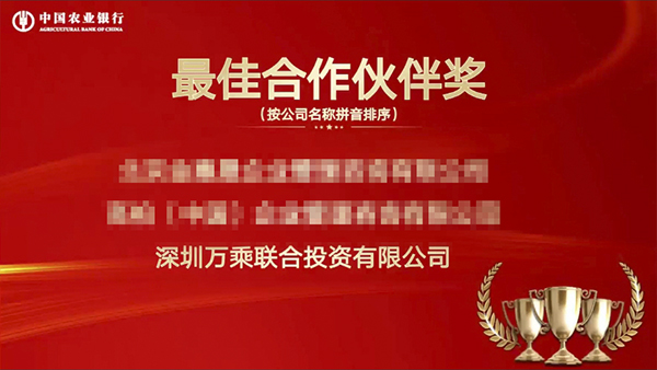 在3月27日中国农业银行召开的全行信用卡委托催收业务工作会议上,万乘集团荣获中国农业银行信用卡中心颁发的2019年“最佳合作伙伴奖”。