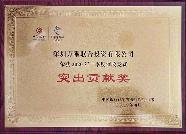 2020年6月5日,辽宁万乘荣获中国银行辽宁省分行颁发的“2020年一季度催收竞赛突出贡献奖”奖牌。