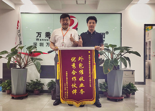 2020年6月18日,民生银行太原信用卡中心温总一行莅临山西万乘检查指导工作,并为山西万乘获得“外包催收业务优秀合作伙伴”荣誉称号颁发锦旗,山西万乘总经理王龙热情接待了来访领导。