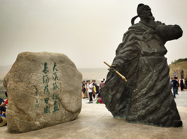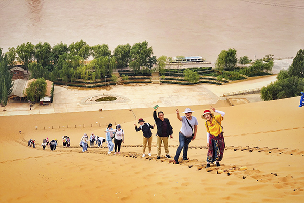 第二天一早,我们像欢呼雀跃的小鸟继续启程,天虽然变得阴沉沉,但阻挡不了我们向沙漠进军的热情,30分钟车程后,我们到达中国最美的五大沙漠之一—沙坡头景区,沙坡头地处腾格里沙漠东南边缘,这里集大漠、黄河、高山、绿洲为一体,景色雄奇,视野开阔,有一种古朴苍凉之大美,极富层次感!天公作美,太阳终于露出了笑脸,我们走到“”天下黄河第一尊”入口,乘坐快艇,在浊浪滔天的黄河上冲波劈浪,经历一番惊险刺激的航程后到达沙坡头,体验第一个从未尝试过的惊魂项目——沙漠爬梯,梯高而陡,沙软且滑,一不小心就会踩空坠落………但大家发扬团队精神,咬紧牙关,不畏困难,鼓足勇气一层一层爬上去,不放弃,不抛弃!万乘人坚韧与执着的精神体现得淋漓尽致!