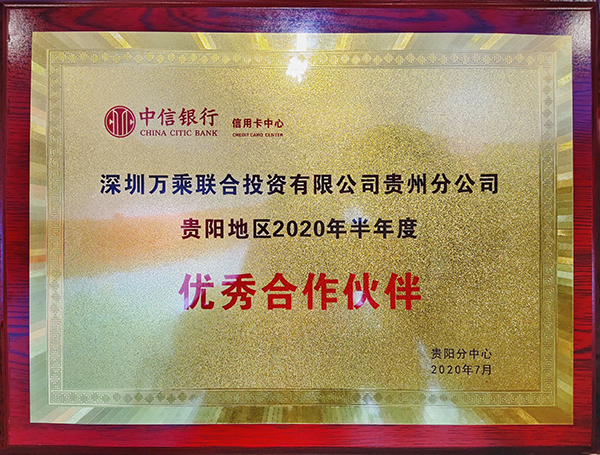 2020年7月10日,贵州万乘总经理助理王新峰参加了中信银行贵阳分行信用卡中心的颁奖会议,并荣获中信银行贵阳分行信用卡中心颁发的贵阳地区2020年半年度“优秀合作伙伴”牌匾。
