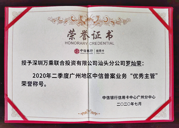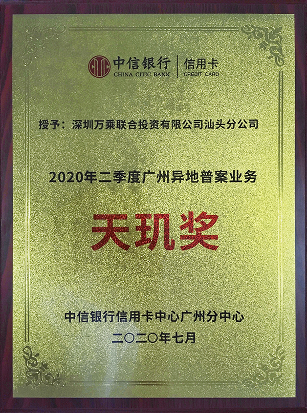 烈日当空,激情似火。在2020年7月3日召开的中信银行信用卡中心广州分中心的颁奖会议上,汕头万乘荣获中信银行信用卡中心广州分中心颁发的2020年二季度广州异地普案业务“天玑奖”牌匾和2020年二季度广州地区中信普案业务“优秀主管”荣誉证书。