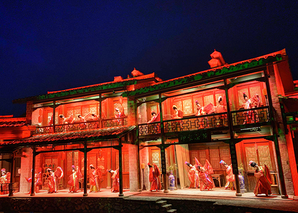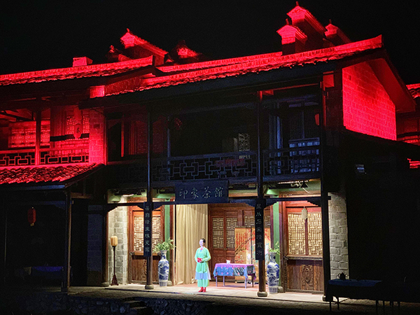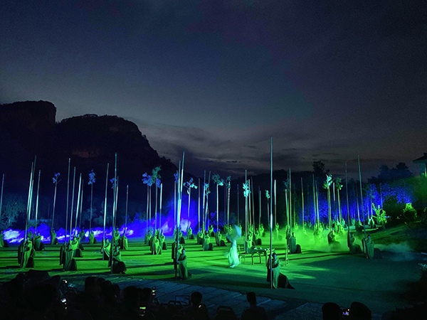 在演出中,分为盛唐唱歌,竹林群舞,神话传说,炒茶表演,竹筏漫游等五个篇章。银幕联动放映,辅以唯美的音乐,如流水月华初去,又似白云灵动渐来。演员们淋漓尽致地演绎了自古至今我们对茶的诠释和解读。