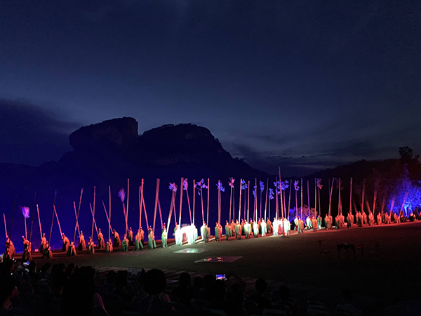 真山真水的实景演出,“印象大红袍”是张艺谋、王潮歌、樊跃组成的“印象铁三角”创作的,旨在展示中国的茶文化,运用全球首创三百六十度旋转观众舞台。