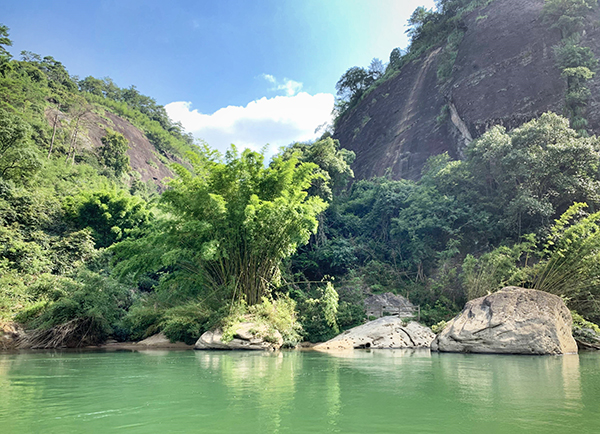 我们乘车来到武夷山自然保护区黄岗山南麓的星村码头,便迫不及待地登上弓形古朴的竹筏。因武夷山有三十六峰,九十九岩。峰岩交错,溪流纵横,九曲溪贯穿其中,蜿蜒十五华里。又因它有三弯九曲之胜,故名为九曲溪。