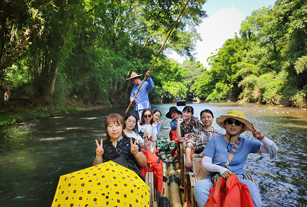 筏工一点、一推、一收,竹排就开始顺着清凉晶莹的溪水漂流而下。俯看竹排下的溪水是那么清澈,温柔地潺潺流动。竹排好似在绿色的丝带上轻盈地滑动。红眼小鱼时而敏捷地跃出水面抢食,时而潜入水中无影无踪,似乎在与游客嬉戏玩耍。听着筏工幽默的解说,清爽和惬意荡漾心间。