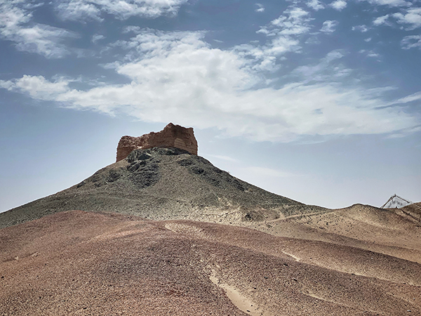 而后我们来到汉长城遗址。汉代城障坞堡的周围,一座座雄伟的烽隧依旧巍然矗立在无垠戈壁中,虎气雄风不减当年,仿佛手执戈矛的甲士刚刚登临过,战斗的硝烟尚未散尽。