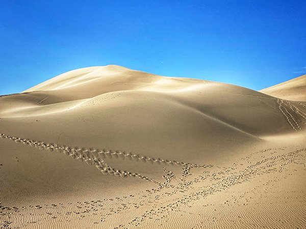 远观,成排的骆驼沿着弯曲小路向沙山深处行进,骆驼和人变得越来越小,形成了一条无限延长的曲线,这景色真叫一个壮观。