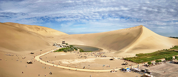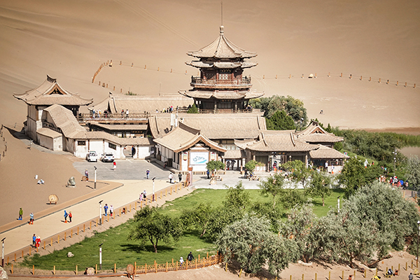 绿树萦绕的月牙泉给人一种清爽明镜之感。远远望去,月牙泉南侧有一组楼阁建筑,与清澈的月牙泉相映生辉,且有几分神秘。身居月泉阁上远近风光尽收眼底,远处沙滩上的游人密密麻麻,成为点缀。