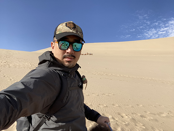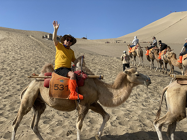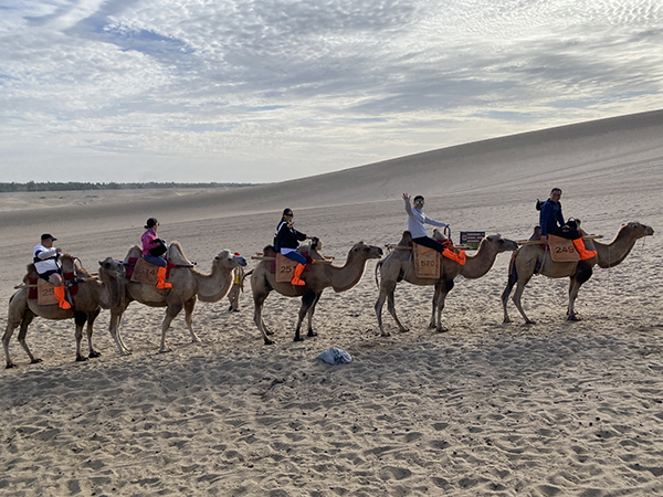 随后,我们被分成几个组,在牧民的带领下,跟着骆驼队前行。骑骆驼并不轻松,腰部需要前后摇摆,要和骆驼的起伏节奏保持一致,才会比较轻松。
