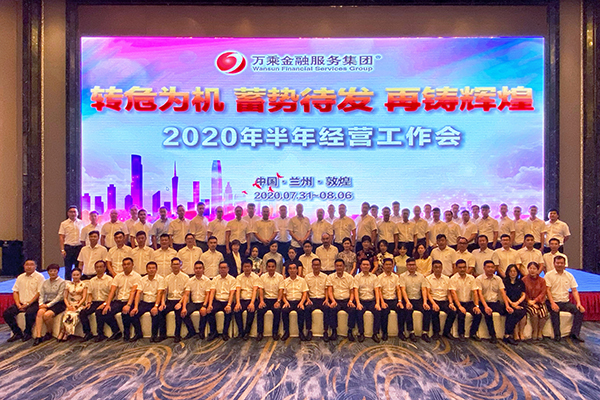2020年8月5日,万乘金融服务集团在兰州召开以“转危为机 蓄势待发 再铸辉煌”为主题的半年工作会议。万乘金融服务集团CEO/总裁韩晓、集团首席财务官雷波、集团董事会秘书兼行政人事部总经理刘润东、集团副总裁杨帅、集团副总裁周卫平、14个集团职能部门负责人及73家分公司、14家办事处营业机构负责人共86名高管出席会议。