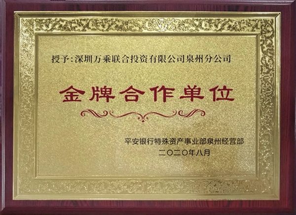 在2020年8月21日召开的平安银行特殊资产事业部泉州经营部的颁奖会议上,泉州万乘荣获平安银行特殊资产事业部泉州经营部颁发的2020年平安银行特殊资产事业部泉州地区上半年“金牌合作单位”奖牌。
