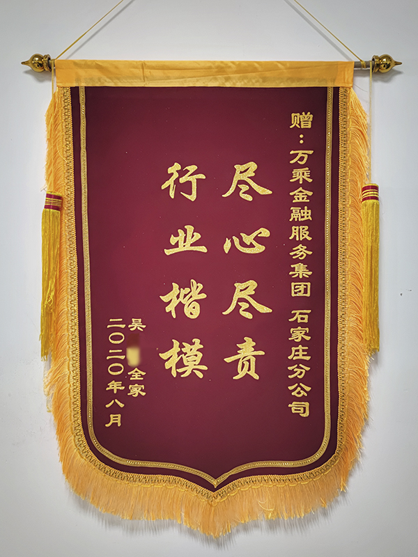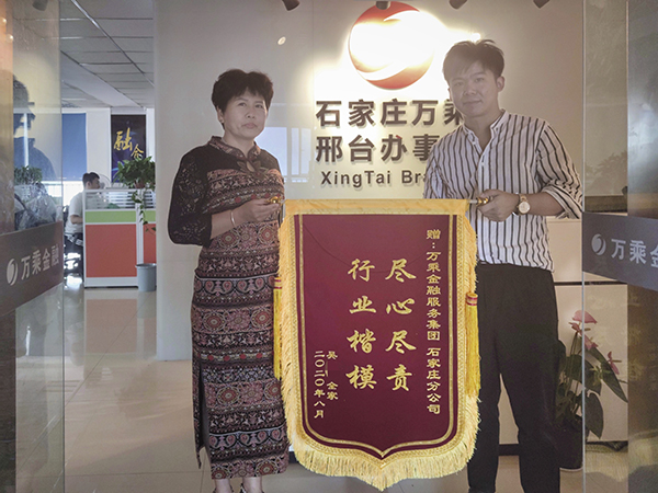 2020年8月29日,中信银行持卡人家属康女士携锦旗前往石家庄万乘邢台办事处,表示感谢。将一面写有“尽心尽责,行业楷模”的锦旗送至公司,表达对我司催收服务人员的感激之情及对我司的服务宗旨表示赞扬。