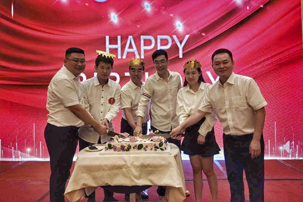 8时许,摇曳着烛光的蛋糕车推到了舞台中央,韩总裁、周副总裁、邱总与三名优秀员工代表一起许愿,一起吹蜡烛,并在全体员工合唱的生日歌中切开蛋糕。
