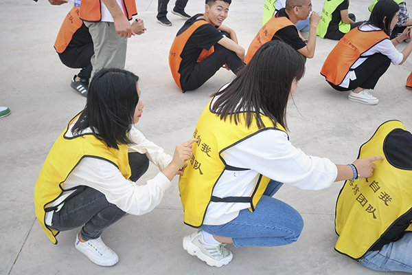 我们一行人分成了三个小组,每组都是一个团队。教官限定我们在五分钟内来给自己的队伍起队名、选队歌和口号以及团队造型。经过大家一番探讨之后,最终确定了队名分别是“冲锋队”、“英雄队”、“无敌队”。并给本队起口号、设计队形,所有这些程序,全部在规定时间之内完成。这是集体智慧与团队精神的考验,尽管时间短暂,但每个队都给出了优异的答案。