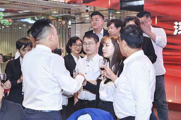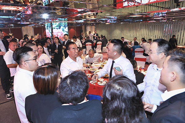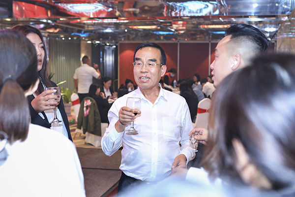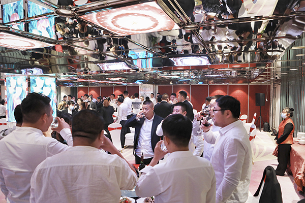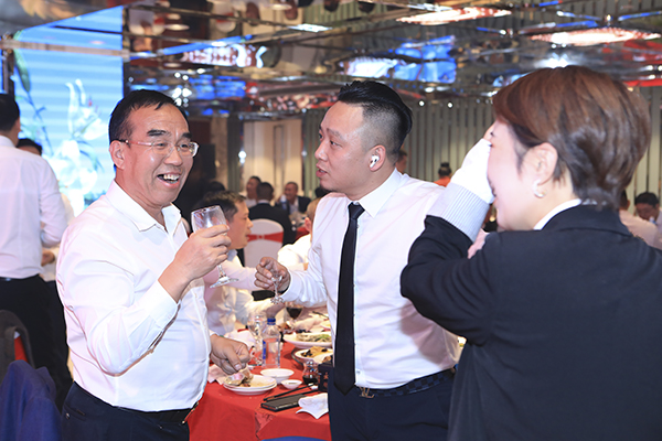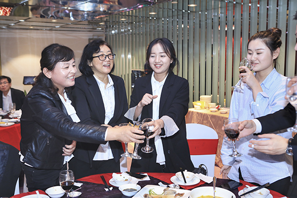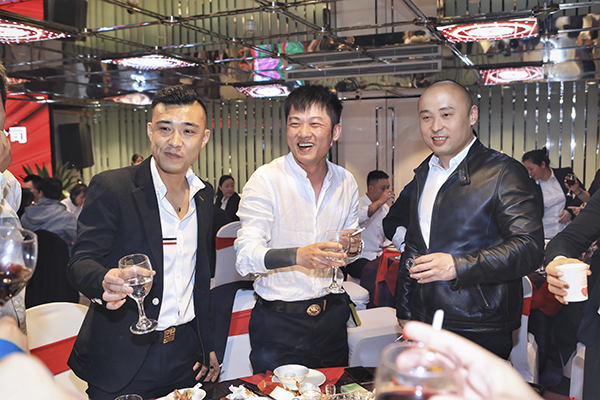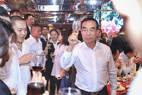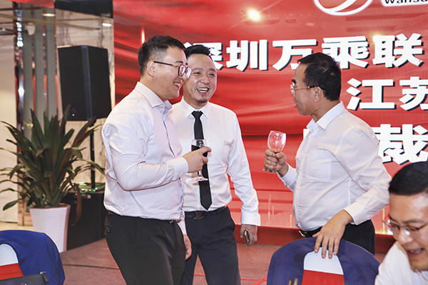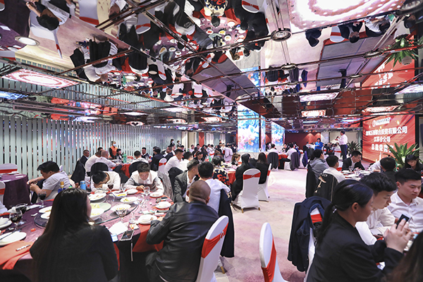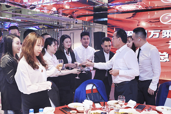 晚上6时许,刚刚拍完“全家福”的140名员工汇聚到金碧辉煌、流光溢彩的四星酒店南京太和紫金大酒店,欢声笑语,其乐融融,共享万乘的荣耀时刻。