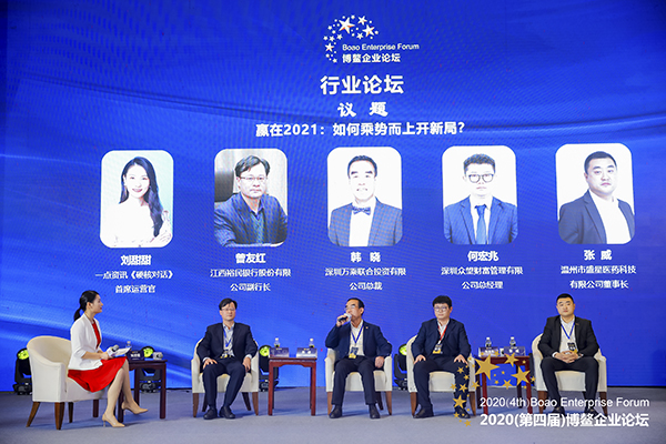 在当天下午举行的博鳌圆桌会上,韩晓总裁与江西裕民银行副行长曾永红、一点资讯首席运营官刘甜甜、深圳众望财富管理公司总经理何宏兆、温州盛星医药科技公司董事长张威等优秀企业家一起,围绕“赢在2021:如何乘势而上开新局”这个议题进行了对话和研讨。