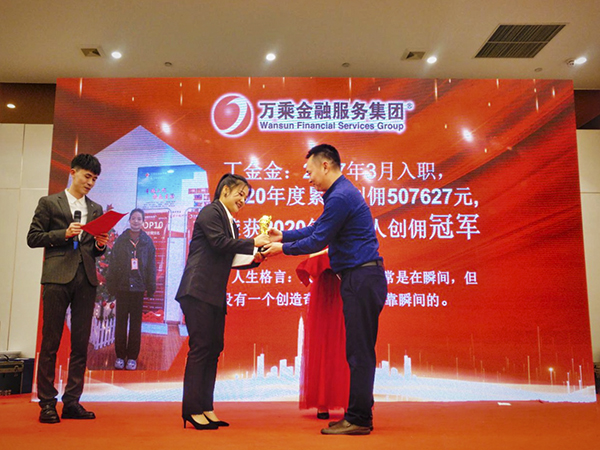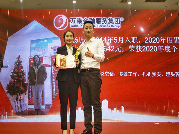 接下来进入本次的重头戏,也是大家最期待,最激动人心的时刻,年度表彰大会环节,特别指出的是,这次的冠亚军都出自农行组,可谓人才济济。周总担任颁奖嘉宾向2020年度个人累计创佣冠军的丁金金同志颁发了荣誉证书及奖杯,与此同时,柯总向亚军杨珊同志颁发了荣誉证书及奖杯。