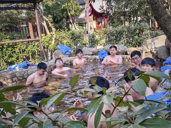 既然来到温泉山庄怎么能不泡温泉呢,下午13.30到达山庄后,大家兴致高昂,看见干净清澈的温泉水他们摩拳擦掌,跃跃欲试,迫不及待的享受温泉,泉水缓缓流淌不息,滚滚溅起层层氤氲,置身其中,让人流连忘返。
