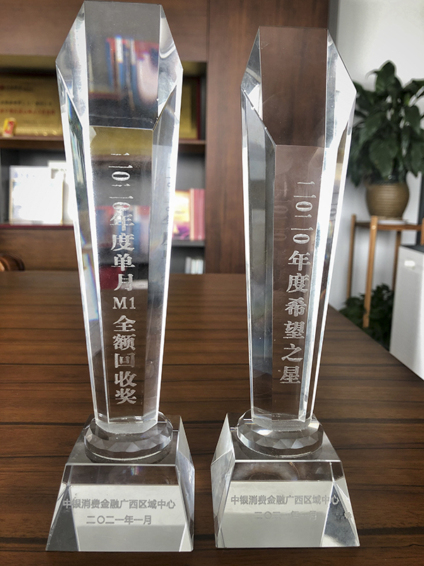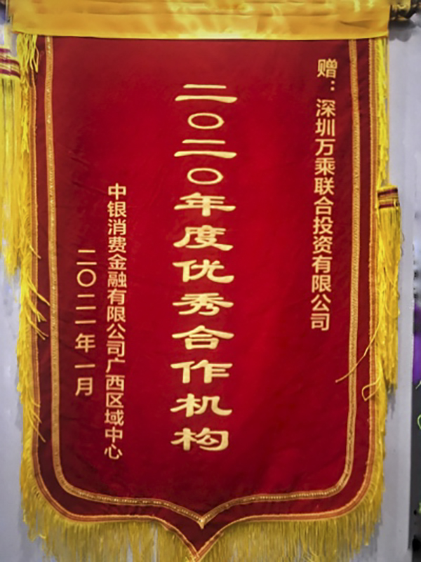 2021年1月,在中银消费金融公司广西区域中心召开委外公司年度总结大会暨2020年第4季度M1大会战以及年度表彰大会上,广西万乘荣获中银消费金融公司广西区域中心2020年度“优秀合作机构”、“希望之星”、“单月M1全额回收奖”三项大奖。