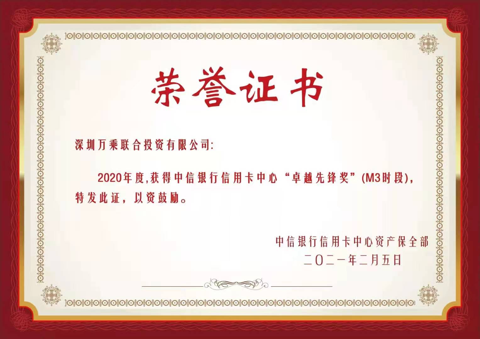 2021年2月5日,深圳万乘荣获中信银行信用卡中心资产保全部颁发2020年度“卓越先锋奖”(M3时段)荣誉证书。
