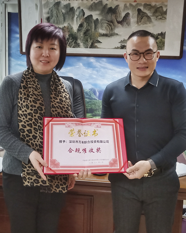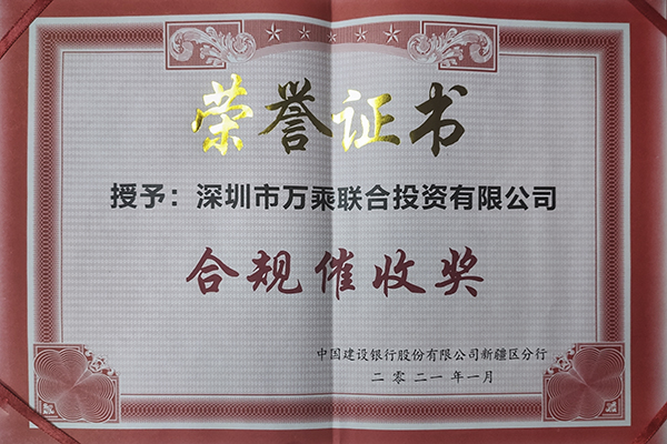 2021年2月2日,中国建设银行新疆区分行组织了“新疆分行2020年委外催收总结表彰和压降投诉”电话会议,新疆万乘荣获中国建设银行新疆区分行2020年度“合规催收奖”。并于2021年3月4日,由中国建设银行新疆区分行申军慧主管亲自来访我司赠予荣誉证书,新疆万乘总经理陈铿热情接待了来访领导。