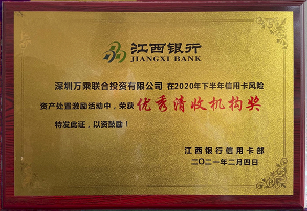 2021年3月11日,江西万乘荣获江西银行信用卡部颁发2020年下半年信用卡风险资产处置激励活动“优秀清收机构奖”。