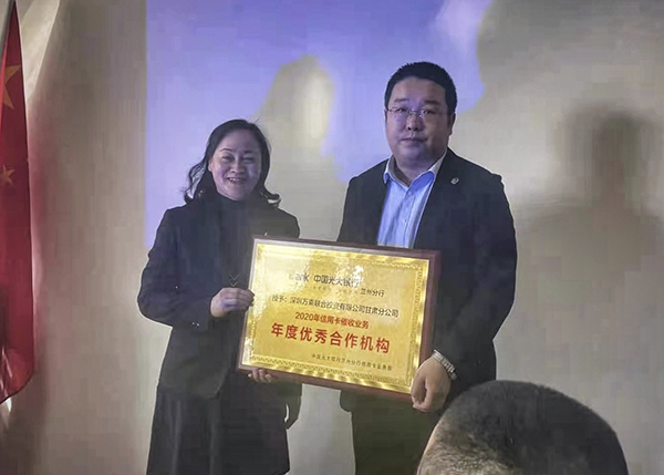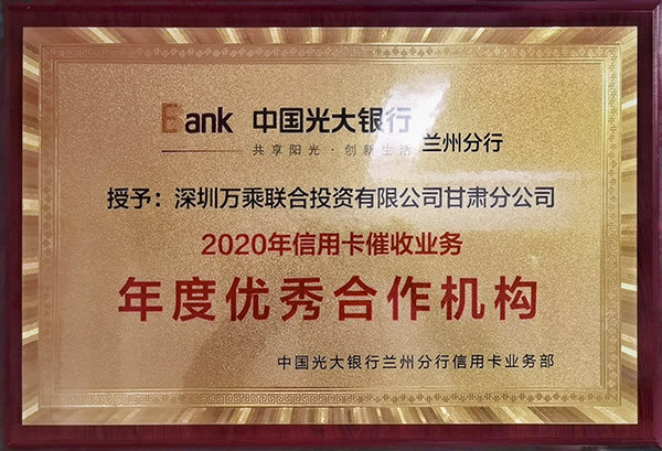 2021年3月11日上午,在中国光大银行兰州分行信用卡部召开的2020年度委外催收工作表彰会议上,甘肃万乘荣获中国光大银行兰州分行“2020年信用卡催收业务年度优秀合作机构”奖项。甘肃万乘总经理张廷应邀出席会议。