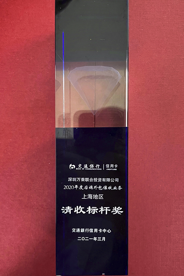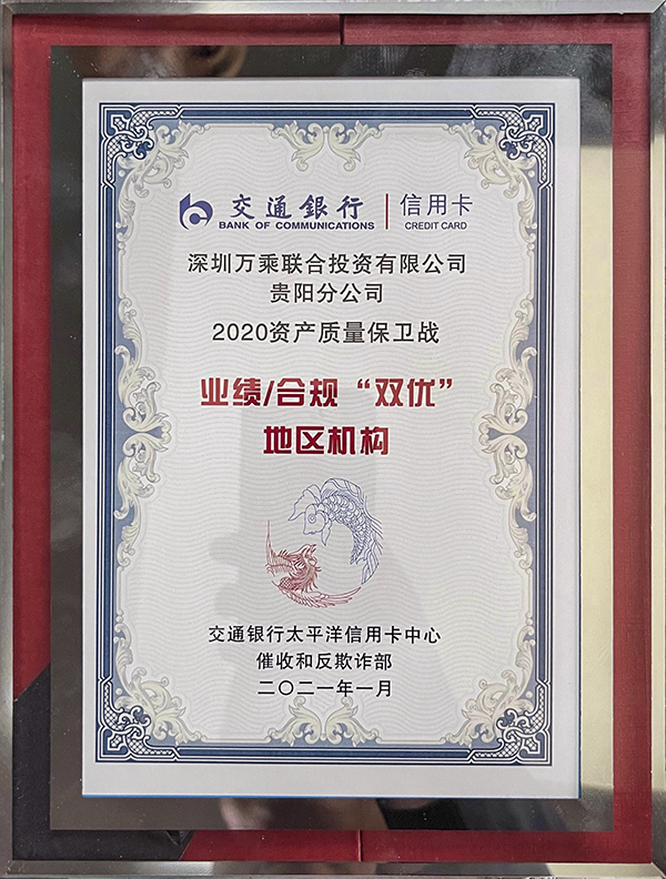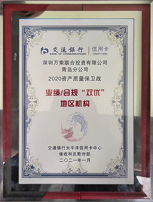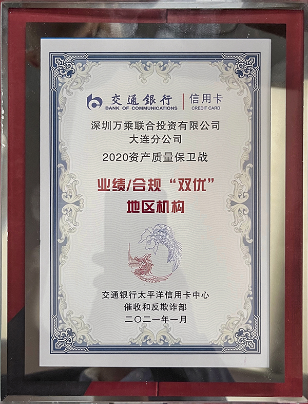此外,万乘集团还荣获太平洋信用卡“2020资产质量保卫战业绩标杆奖”和“2020年度后端外包催收业务锦鲤奖”。上海分公司荣获“2020年度后端外包催收业务上海地区清收标杆奖”,贵阳分公司、天津分公司、大连分公司、青岛分公司荣获“2020年资产质量保卫战业绩/合规地区机构奖”。