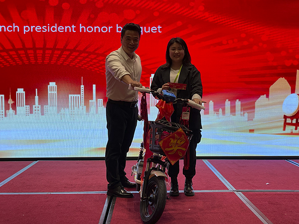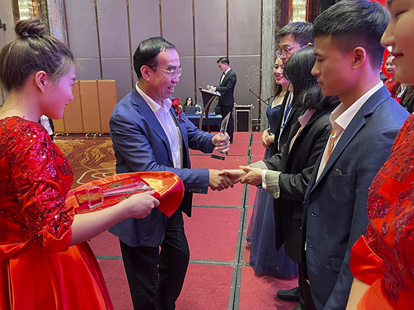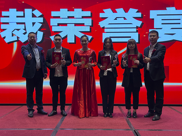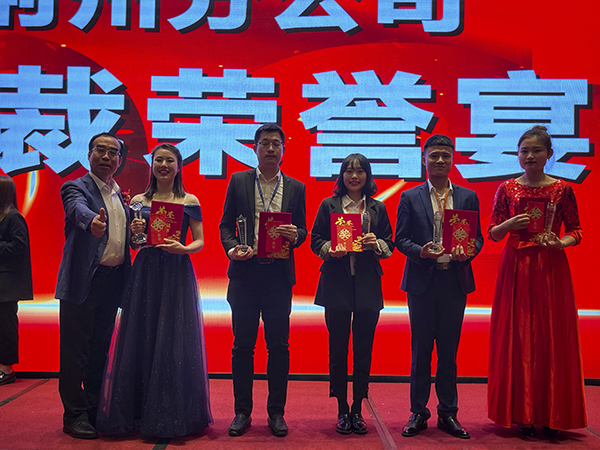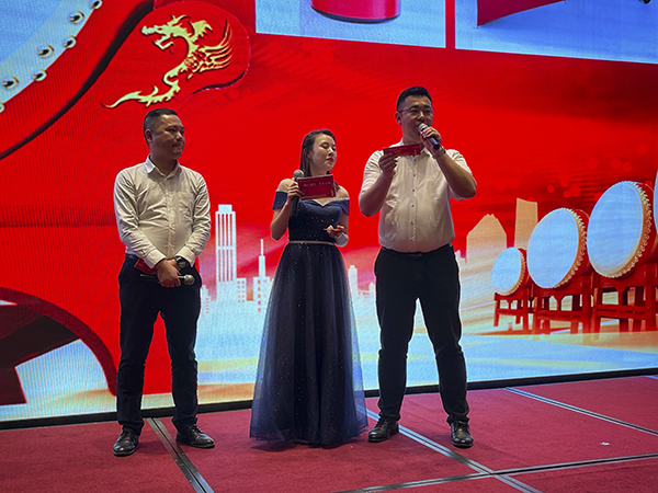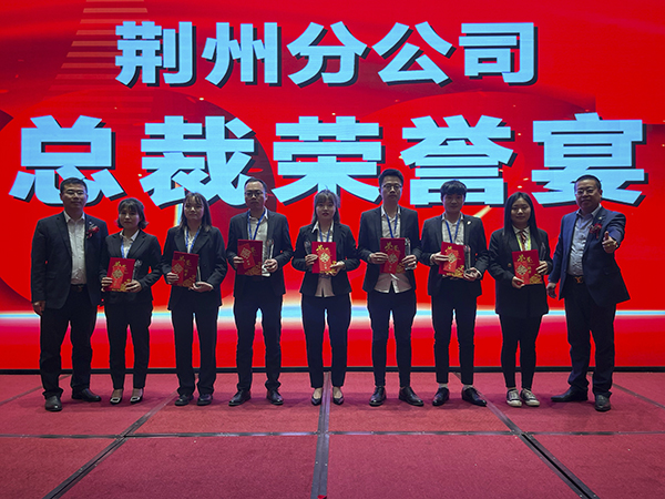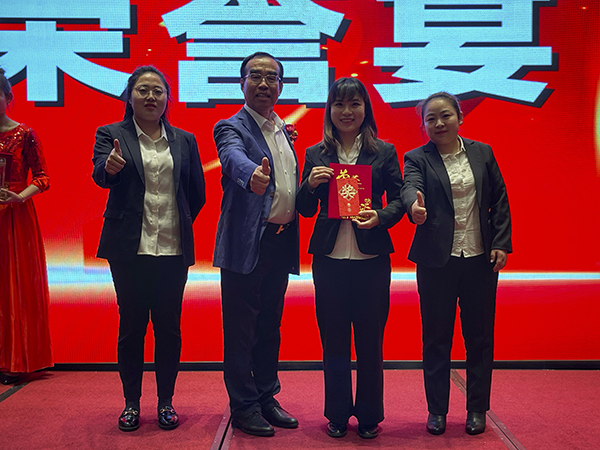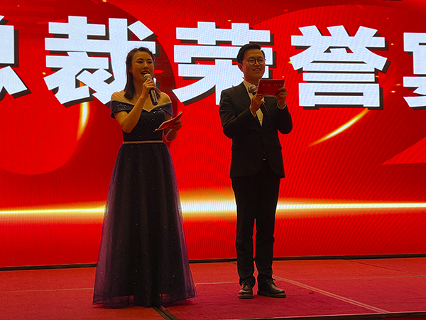 在欢快的音乐声中,韩总裁、韩超总、荆州万乘副总经理白云冰总分别上台,为30名获得2020年度各种奖励的优秀员工颁发奖杯、获奖证书和奖金。