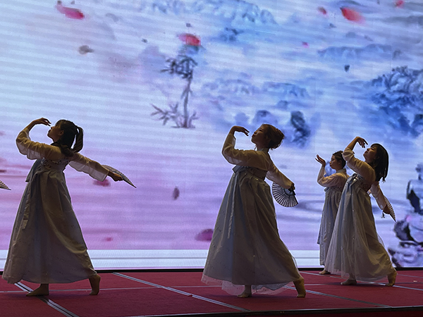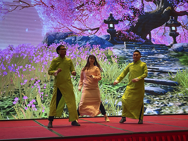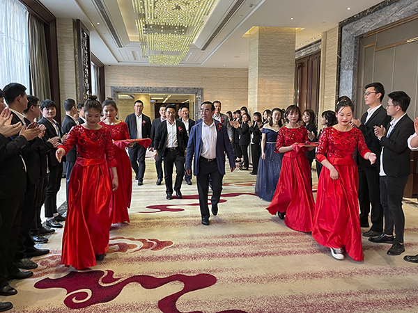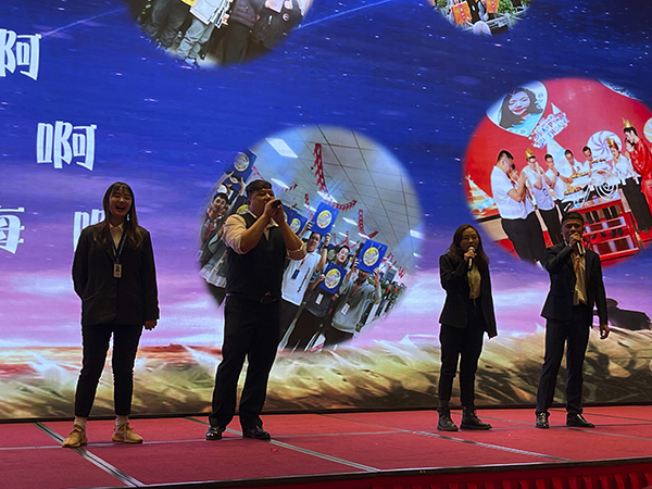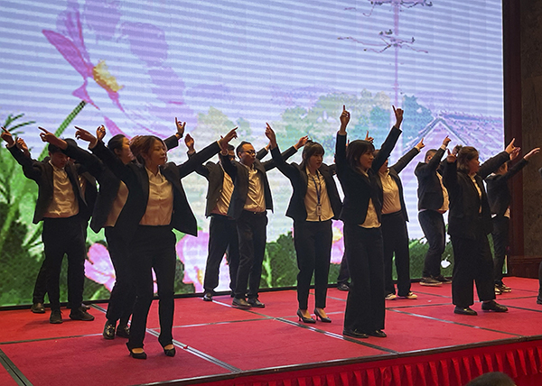 两曲火辣奔放的舞蹈后,韩总裁、韩超总、白云冰总和襄阳万乘副总经理甘涌走上舞台,向全体员工和嘉宾敬了三杯酒。宾主共同举杯,祝荆州万乘牛气冲天,财源滚滚,业绩长虹。