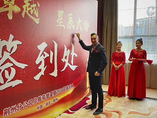 万乘集团总裁助理兼湖北大区总经理韩超代表荆州分公司140名将士郑重表态:荆楚大地自古多善战之士,经过2020年血与火的淬炼,2周岁的荆州万乘已经长大和成熟,今年有信心实现团队规模超过200人,月度佣金收入超过200万元的既定目标,为万乘的宏图大业贡献力量!