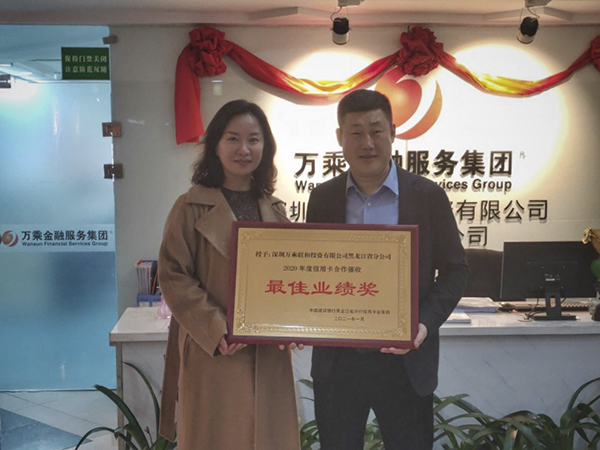 2021年1月,黑龙江万乘荣获中国建设银行黑龙江省分行信用卡业务部2020年度信用卡合作催收“最佳业绩奖”。在2021年3月25日,中国建设银行黑龙江省分行信用卡业务部邱京红副总经理、风险科孙超群科长莅临黑龙江万乘职场,专程为黑龙江万乘颁发此荣誉牌匾,黑龙江万乘总经理杨宏亮代表公司参加了颁奖仪式。
