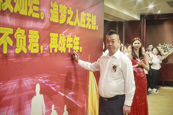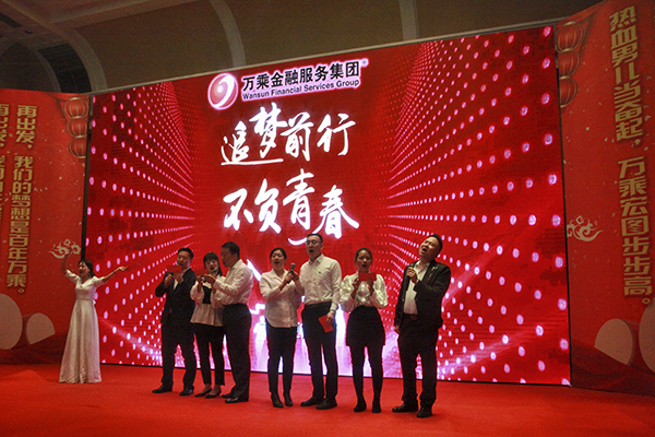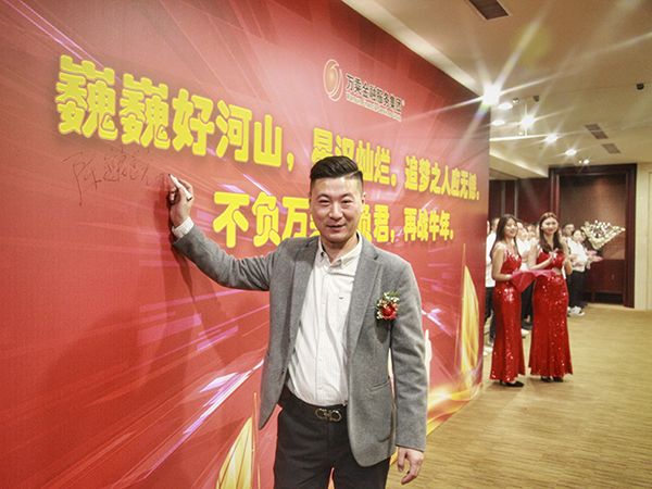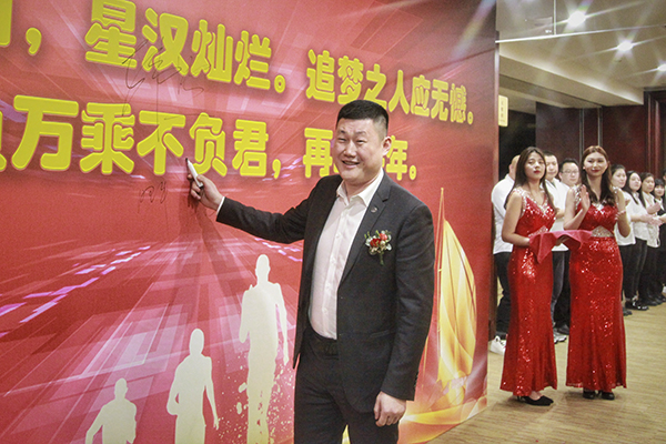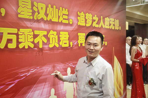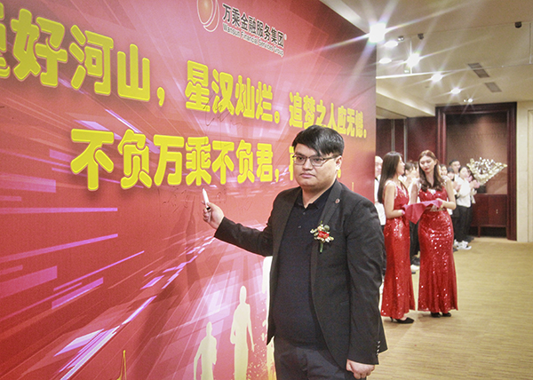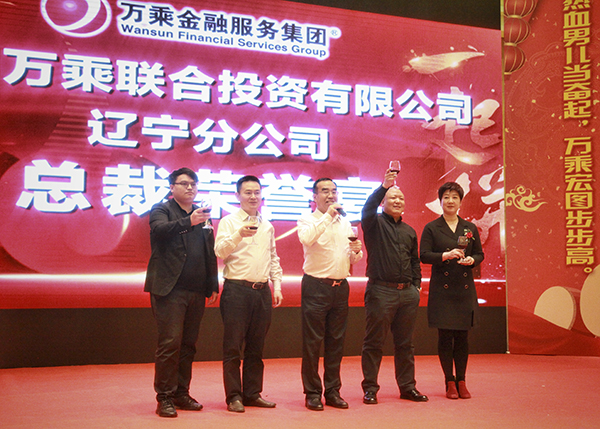 万乘辽宁大区总经理刘津岐与辽宁万乘副总经理李乔联袂上台,代表辽宁公司全体员工郑重表态:感谢总裁百忙之中来沈阳为辽宁团队举办“总裁荣誉宴”。成绩已属于过去,辽宁团队将珍惜荣誉,志存高远,全力冲刺佣金收入400万元的新目标,用优异的业绩证明自己,用亮丽的数据向总裁室交一份满意的答卷。