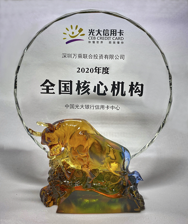 2021年2月24日,在中国光大银行信用卡中心发布的《2020年核心机构评定结果的通知》中,共评选出10家“全国核心机构”,万乘集团以综合得分第二名的成绩忝列“榜眼”,荣获中国光大银行信用卡中心2020年度“全国核心机构”。并于2021年4月,赠予荣誉奖杯。