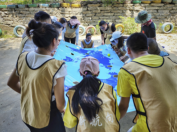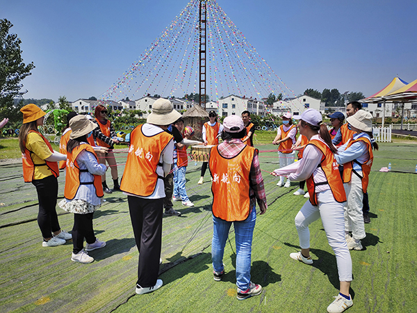 第三个挑战,团队成员需要拉起环游世界的地图,通过全队配合协作使世界球按照一定的路线从起点到达终点,在此过程中世界球不允许掉落,同样也是考验团队协作的游戏,经过前面两个游戏的配合我们团队越来越有默契,通过短短几分钟的的尝试与沟通,随着裁判的哨声,我们开始了这场比赛,途中经过美国,西班牙等各个国家最终到达咱们的终点中国,通过这场游戏,让大家感受到有效沟通的重要性,学到了如何进行有效的沟通,体会到“张弛有度”才是一个团队该有的样子!