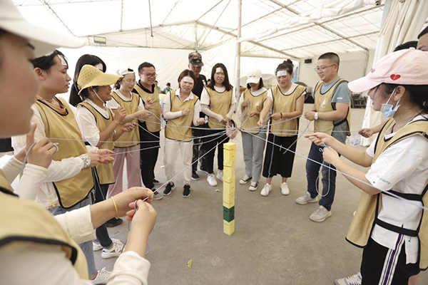 接着我们迎来了第二项挑战,合力建塔游戏,这同样也是一个强调团队协作的游戏,要求团队成员在6分钟内合力操控绳子,将所有的塔块竖直叠在一起并保持10秒不倒,我们大家纷纷拿起脚下的绳子开始尝试,看似简单的游戏,但是在尝试过程中并不是那么顺利,叠不到3块就已经倒了,这时大家的心情都有点急躁,经过几分钟调整沟通之后游戏正式开始,大家都屏住呼吸,抓住绳子保持平衡,小心翼翼的叠加,很快我们就已经完成了所有的塔块,超出了所有人的预期,虽然在尝试过程中频频失败,是大家没有遇到困难就选择放弃,一起努力,同一条心取得了最后的胜利,这个游戏让我们所有人感受到团队的力量是真的很强大!