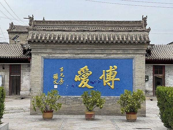 一进大门,一座小巧景致的假山,半挡着人们的视线,使人不能一眼望穿。转过假山是第一院,这是阎锡山故居里最大的一个院子,四面均建厅堂,中间是花坛、假山和喷水池,正面镌刻有当年孙中山先生书赠阎锡山的“博爱”二字手迹。