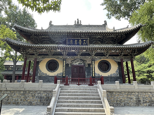 随后我们来到殊像寺。这是文殊菩萨唯一显过灵的地方。寺内的文殊殿是台怀最大的殿宇,殿内正中佛台上供奉的文殊骑狮塑像,高近十米,是五台山诸寺中最高大的一尊文殊塑像。殿内两山及后檐墙上悬有以“五百罗汉渡江”为主题的悬塑群像,为中国传统悬塑作品中的杰作。