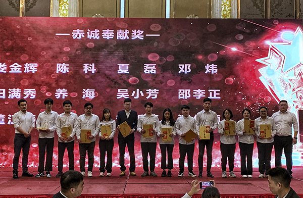 在欢快的乐曲中,宁波万乘副总经理邱岩和杭州万乘副总经理何志龙为获得“赤诚奉献奖”的12名员工颁发获奖证书和奖金。