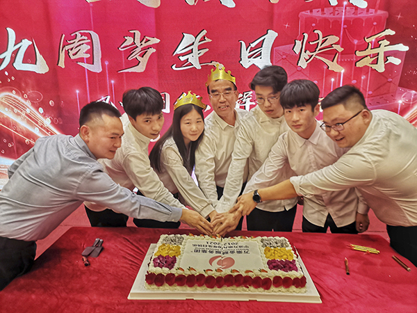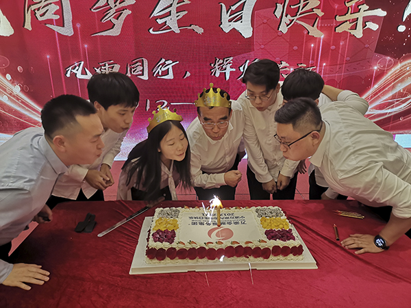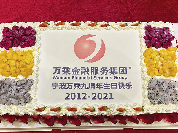 8时18分,庆祝宁波万乘成立9周年仪式拉开序幕。韩总裁、周卫平总经理、邱岩副总经理与4名优秀员工代表登上舞台,在全场人员合唱的生日歌中,许愿、吹蜡烛、切蛋糕,共祝宁波万乘9周岁生日快乐,共祝宁波万乘红红火火,业绩长虹。